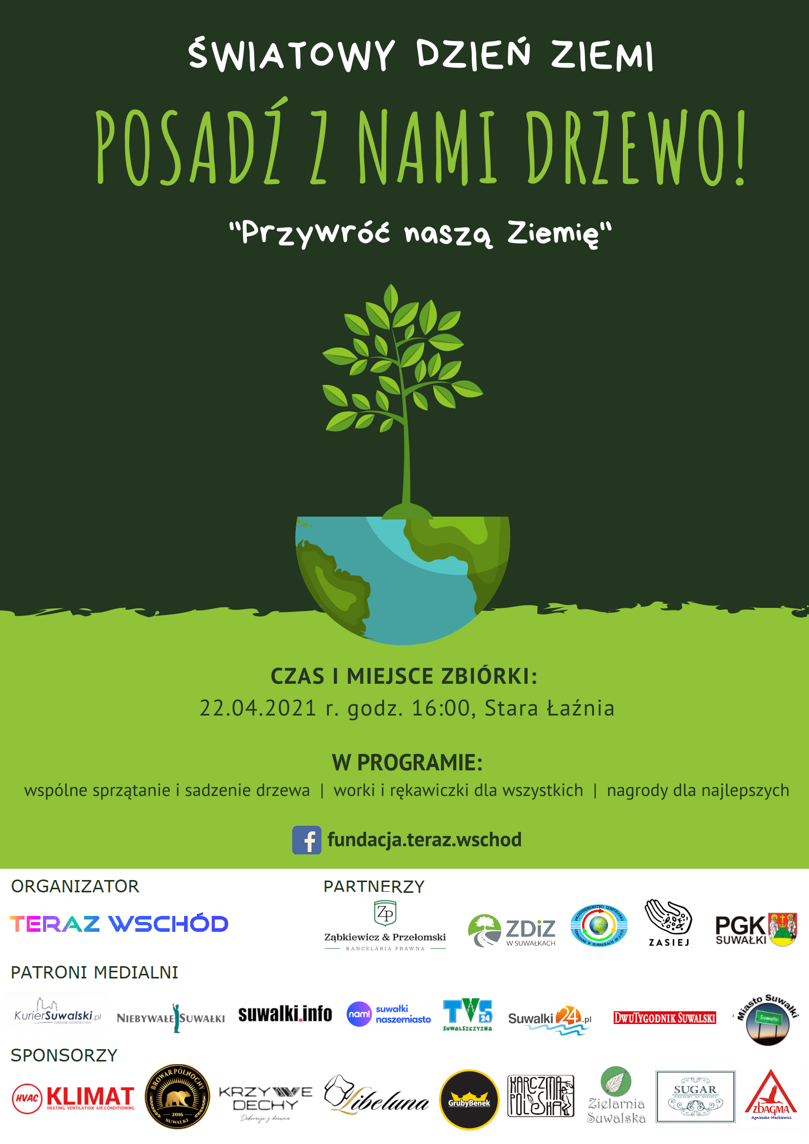 Fundacja Teraz Wschód zaprasza wszystkich chętnych na wspólne świętowanie. Akcja rozpocznie się od sprzątania terenów na bulwarach miejskich i okolic Zalewu Arkadia. Wszyscy uczestniczy otrzymają worki i jednorazowe rękawiczki. Nie lubicie sprzątać? To nie będą zwykłe porządki! Fundacja jak zawsze, zapewnia niesamowitą atmosferę i moc atrakcji. Dla osób, które zbiorą najwięcej śmieci, przewidziane są atrakcyjne nagrody. Na koniec, symbolicznie posadzone zostanie drzewo – bo jak wiadomo, to właśnie drzewa produkują tlen, filtrują powietrze i chronią klimat. Spotykamy się 22 kwietnia (czwartek) o godzinie 16:00 pod budynkiem Starej Łaźni na suwalskich bulwarach.