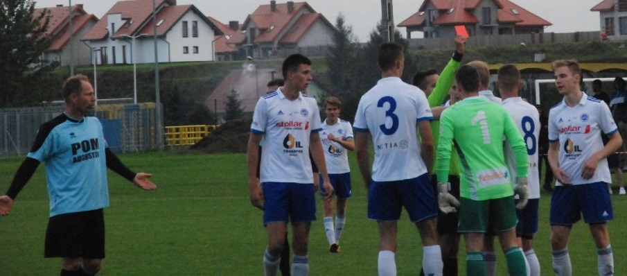 Drugą połowę lepiej zaczęli goście. Nie dość, że pomagał im wiatr, to jeszcze pomocną rękę, a raczej nogę wyciągnął Bartosz Żybura, który na 18 metrze do bramki sfaulował wychodzącego na czystą pozycję Kamila Wilczewskiego i po ukaraniu czerwoną kartką musiał opuścić boisko. Poszkodowany, strzałem z rzutu wolnego starł się zaskoczyć Sztukowskiego, ale nie trafił w światło bramki. W 71 minucie suwalczanie zdobyli trzeciego gola, a Putrę, który obronił strzał i dobitkę, pokonał Przemysław Żukowski. Augustowianie nie starli się zniwelować straty, ale brakowało im przede wszystkim skuteczności. Za to w 87. minucie w swoim polu karnym sfaulowali zawodnika Wigier II. Arbiter podyktował rzut karny, który pewnie wykorzystał Maciej Radaszkiewicz ustalając wynik meczu na 4:1 dla Wigier II.
