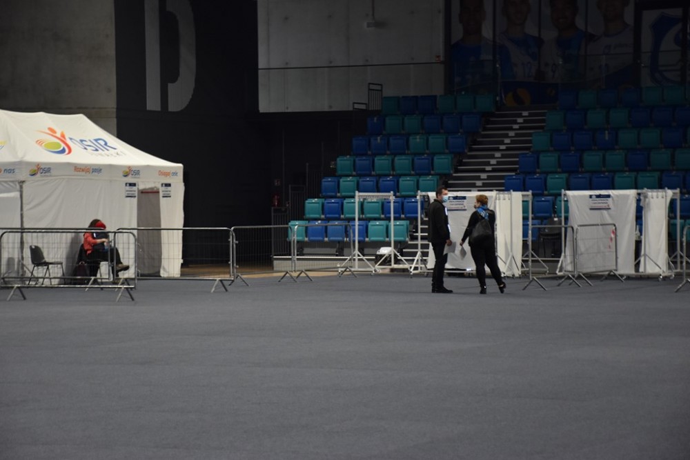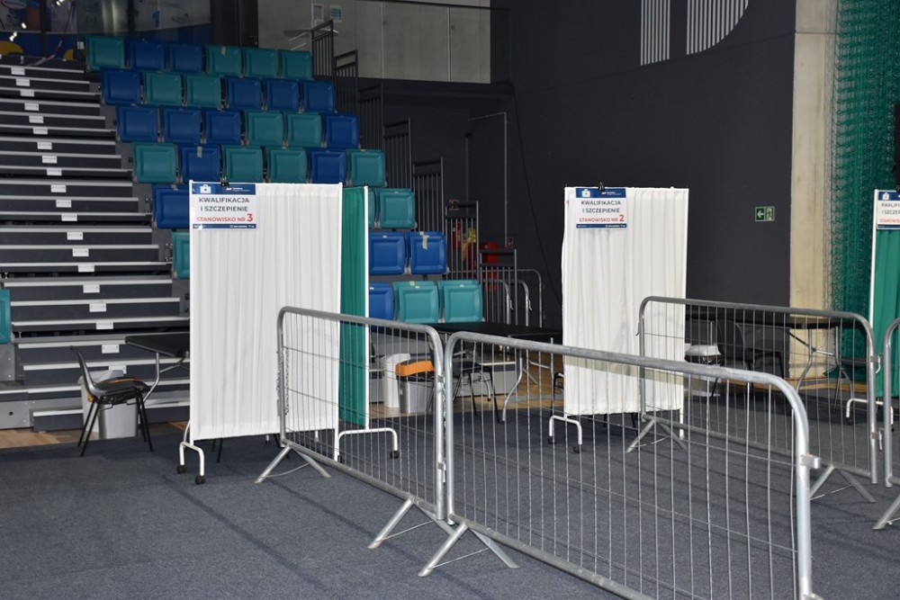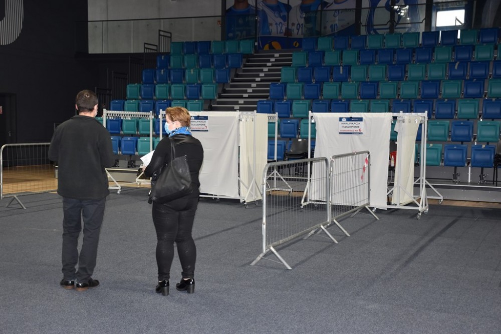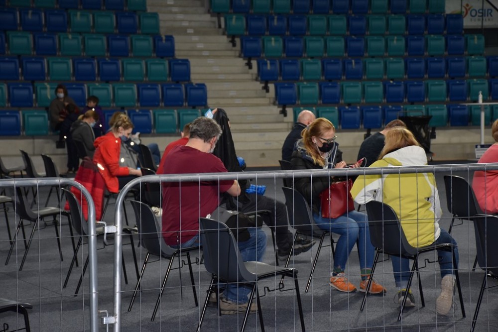 W największej w regionie hali widowiskowo-sportowej nie ma kolejek. Po wejściu wypełniamy formularz i od razu kierujemy się na konsultację z lekarzem i szczepienie, przeprowadzane na czterech stanowiskach, preparatem firmy Moderna. Przed wyjściem odpoczywamy przez kwadrans na krzesełkach w poczekalni, zlokalizowanej na przeciwko stanowisk.