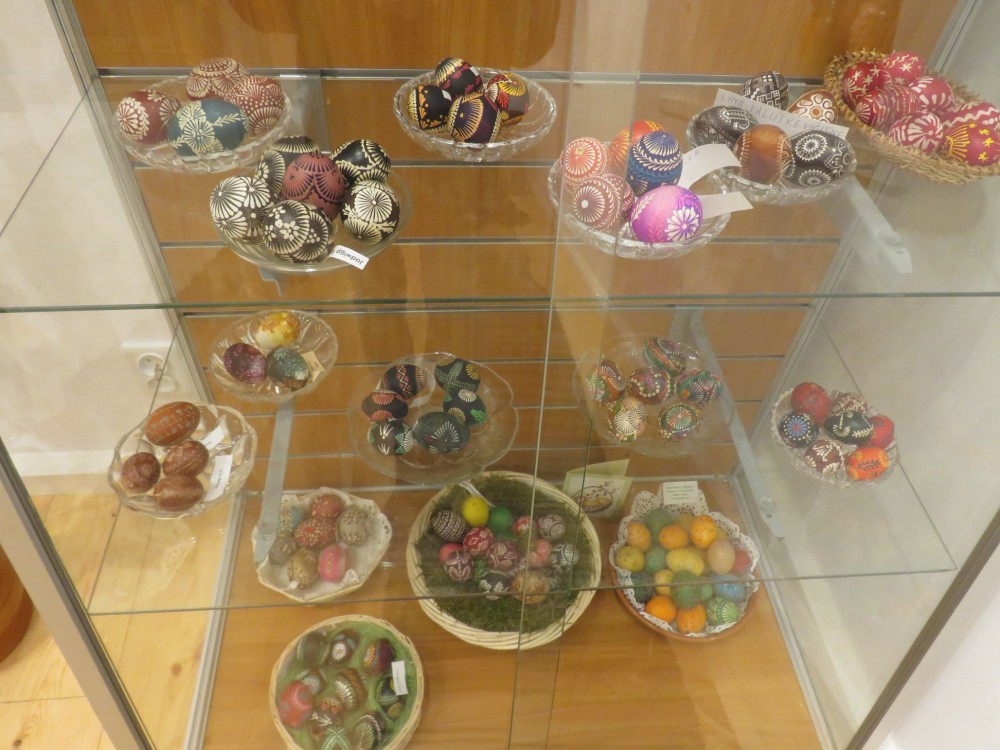 Wystawa Wielkanocna przedstawia pięknie wykonane, liczne pisanki, ręcznie robione palmy wielkanocne, wycinanki z papieru oraz słomiane pająki
