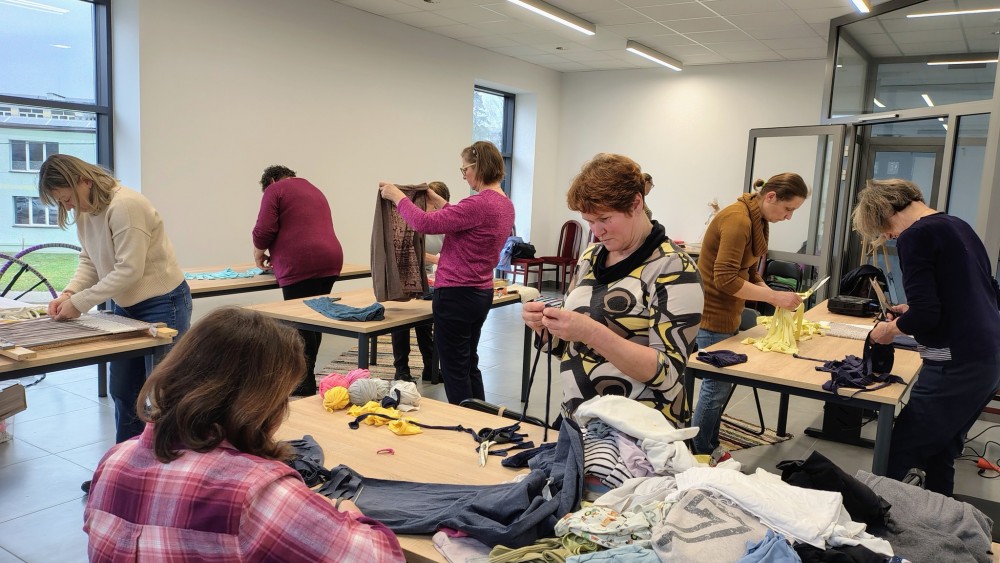 Kilkanaście pań pracowało przez 3 godziny i udało się im wykonać sporo prac, nauczyć się np., jak ze starych koszulek zrobić jeden długi sznurek.