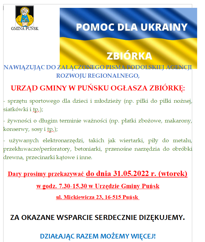 Urząd Gminy w Puńsku ogłosił kolejną zbiórkę darów. Prosi się o dostarczenie m.in.: sprzętu sportowego dla dzieci, żywności z długim terminem przydatności do spożycia, używanych elektronarzędzi.