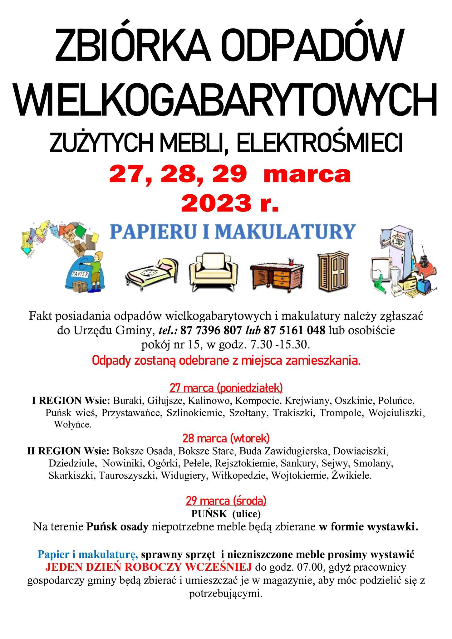 Urząd Gminy w Puńsku informuj, ze w dniach 27, 28, i 29 marca br. odbędzie się zbiórka odpadów wielkogabarytowych, zużytych mebli, elektrośmieci, papieru, makulatury z poszczególnych miejscowości.
