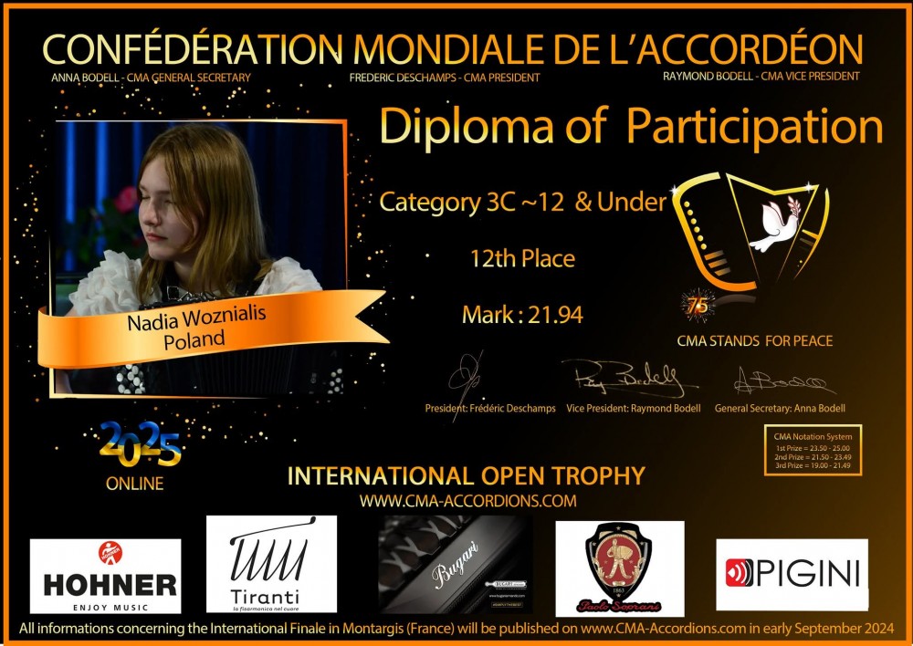 - Nadia Woźnialis z klasy akordeonu mgr Sylwii Sawickiej-Roszko zdobyÅ‚a 12 lokatÄ™ równoważnÄ… z II nagrodÄ… podczas International Open Trophy organizowany przez Confédération Mondiale de l'Accordéon (Francja).