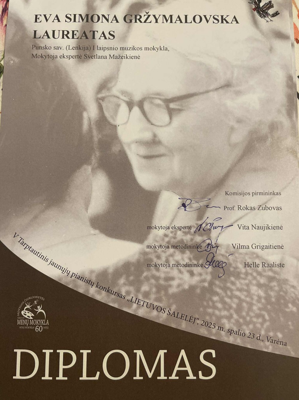 -Ewa Simona GrzymaÅ‚owska z klasy fortepianu pani Svetlany MažeikienÄ— zostaÅ‚a laureatkÄ… V MiÄ™dzynarodowego Konkursu MÅ‚odych Pianistów na Litwie „Lietuvos ŠalelÄ—j” .