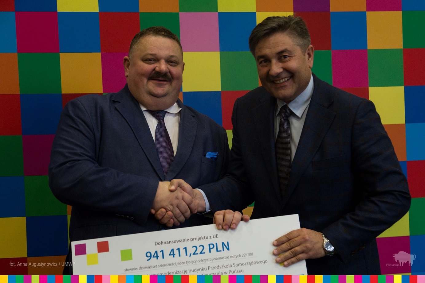 Wójt gminy PuÅ„sk Witold Liszkowski odebraÅ‚ czek na kwotÄ™ 941.411 zÅ‚otych na termomodernizacjÄ™ budynku przedszkola. Termomodernizacja przedszkola samorzÄ…dowego w PuÅ„sku ma kosztować 1,1 mln zÅ‚. ResztÄ™ pieniÄ™dzy na ten cel wykÅ‚ada samorzÄ…d gminy. Inwestycja powinna zostać zrealizowana w 2020 roku. W ramach tej inwestycji przedszkole otrzyma także instalacjÄ™ fotowoltaicznÄ…