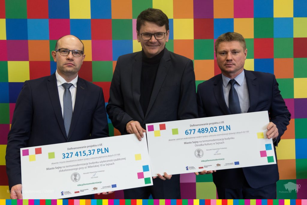 We wtorek, 15 października marszałek województwa podlaskiego i członkowie zarządu wręczyli symboliczne czeki dla 27 beneficjentów na projekty dotyczące termomodernizacji budynków. W tym gronie znalazły Puńsk i Sejny.