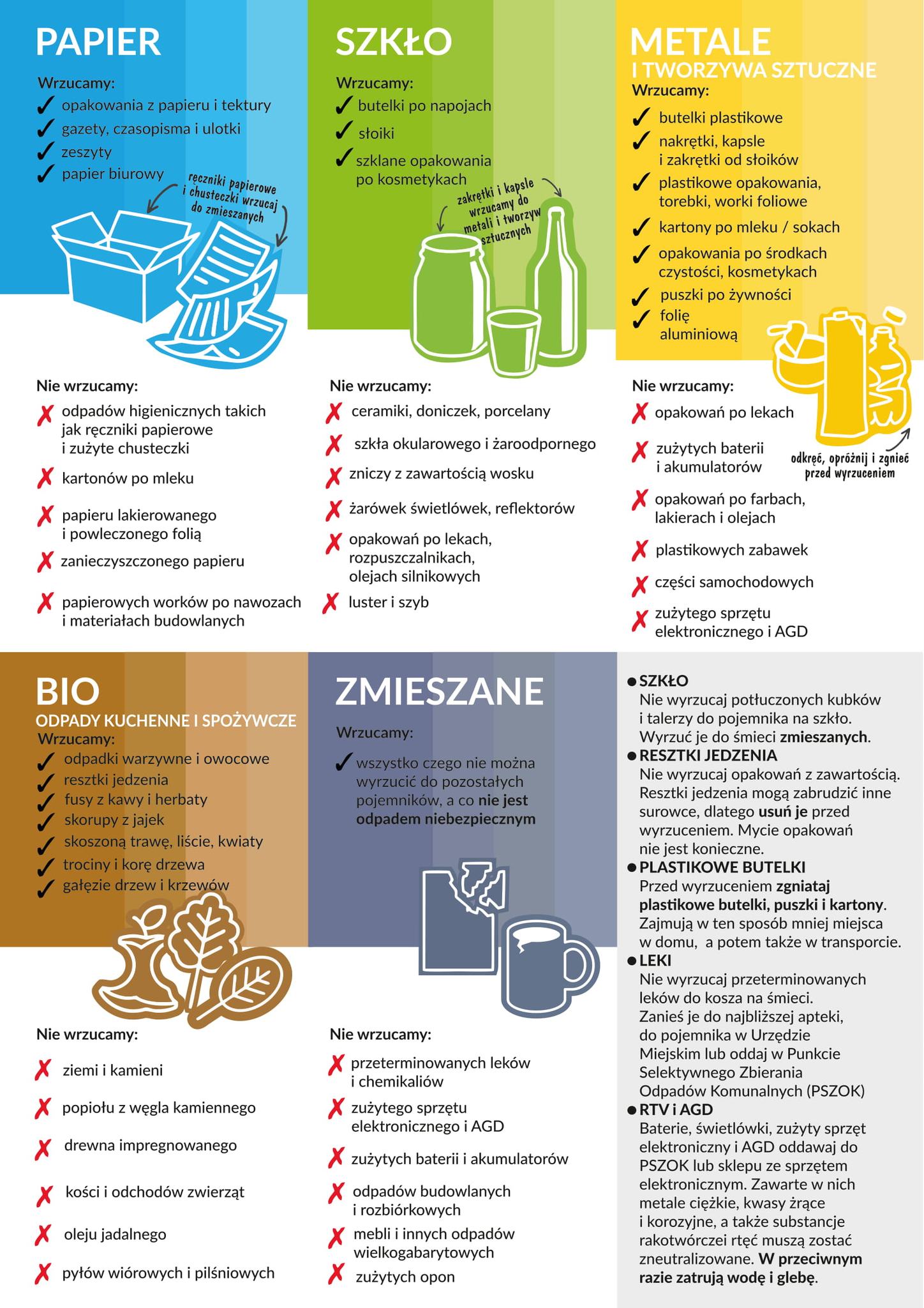 Przypominamy: segregacja odpadów jest obowiÄ…zkowa dla wszystkich mieszkaÅ„ców i dla każdej nieruchomoÅ›ci na 5 frakcji pokazanymi na zdjÄ™ciu. Trzymajmy siÄ™ ustalonych zasad i terminów wywozu!