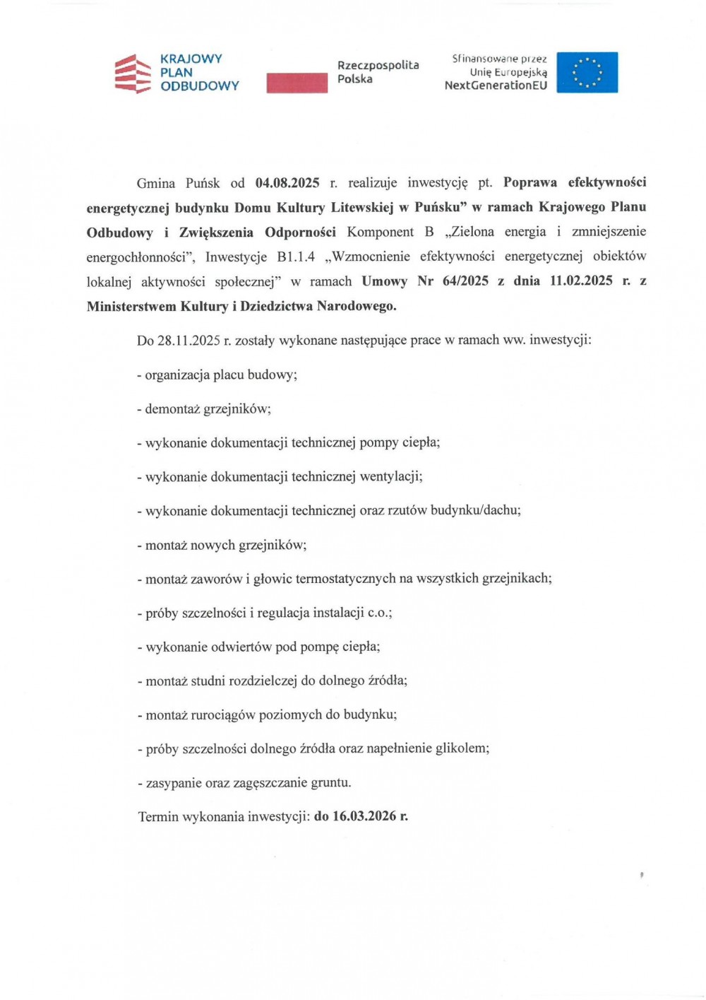 W poÅ‚owie czerwca 2025 roku wójt gminy PuÅ„sk wybraÅ‚ spóÅ‚kÄ™ Termotechnology z BiaÅ‚egostoku na wykonawcÄ™ termomodernizacji Domu Kultury Litewskiej. Do przetarg ustanego aż 10 firm, ale pozostaÅ‚e oferty - z różnych powodów - zostaÅ‚y odrzucone. SpóÅ‚ka z BiaÅ‚egostoku zaoferowaÅ‚a najniższÄ… cenÄ™ - 2 950 770 zÅ‚ brutto, podczas gdy gmina liczyÅ‚a siÄ™ z wydatkiem rzÄ™du 3 933 000 zÅ‚ brutto.