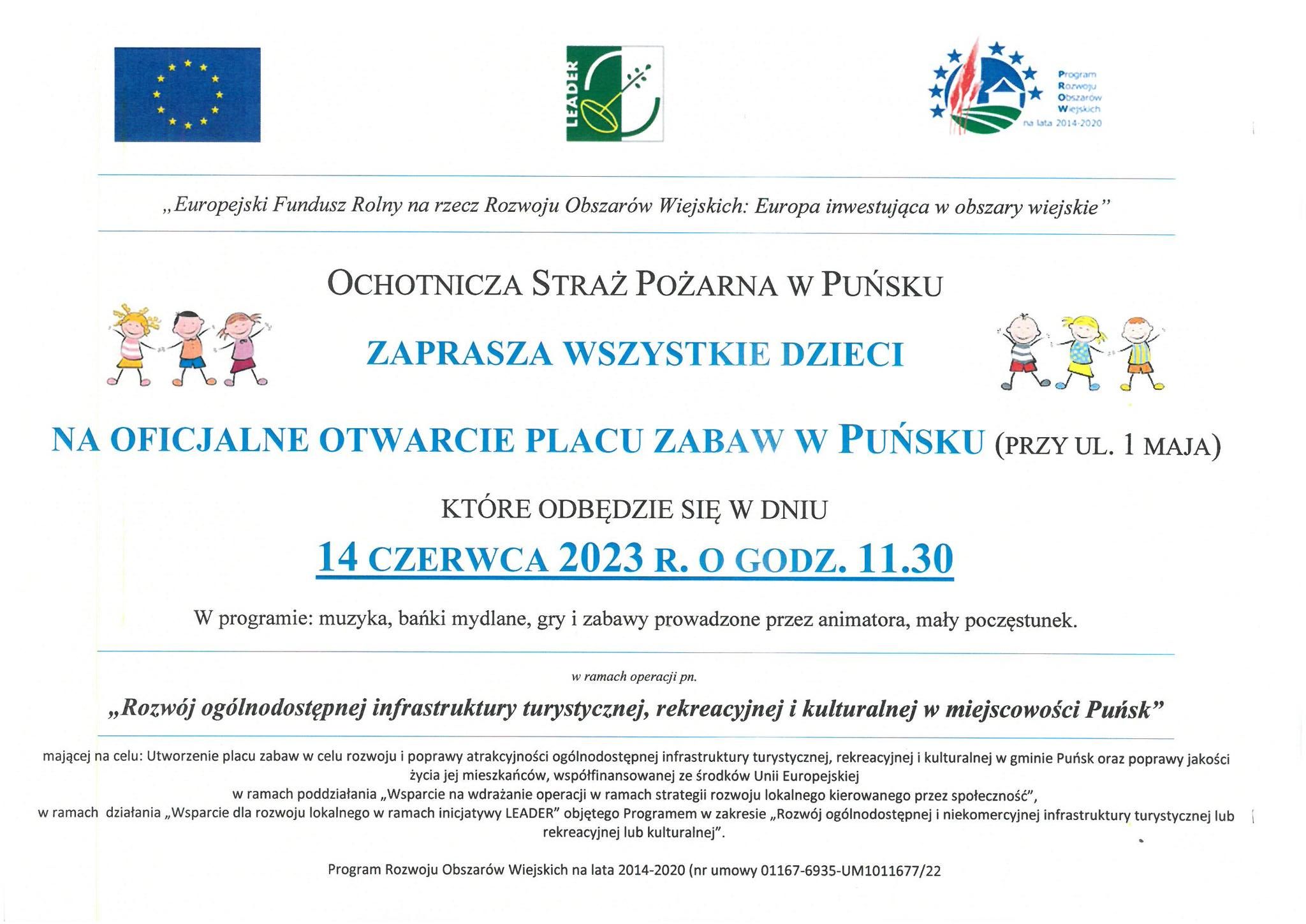 Strażacy ochotnicy z OSP w PuÅ„sku otrzymali w ub. roku od samorzÄ…du wojewódzkiego, za poÅ›rednictwem Lokalnej Grupy DziaÅ‚ania, 99 tysiÄ™cy zÅ‚otych na urzÄ…dzenie placu zabaw dla dzieci w powstajÄ…cym ogólnodostÄ™pnym parku w PuÅ„sku. PieniÄ…dze pochodziÅ‚y z Europejskiego Funduszu Rolnego na Rzecz Rozwoju Obszarów Wiejskich, a tytuÅ‚ projektu to:” Rozwój ogólnodostÄ™pnej infrastruktury turystycznej, rekreacyjnej i kulturalnej w miejscowoÅ›ci PuÅ„sk.
