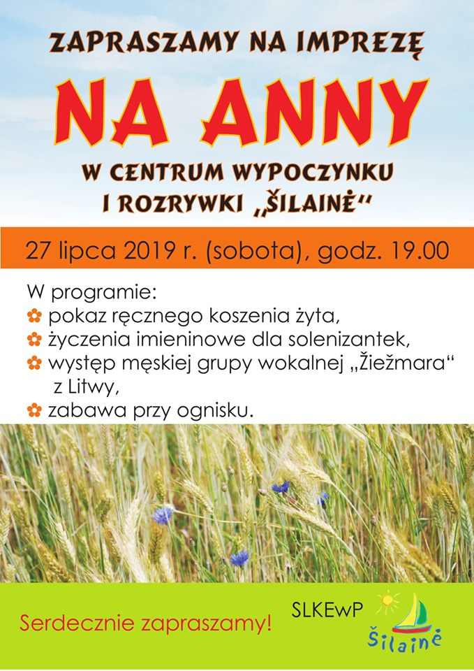 Centrum Wypoczynku i Rozrywki "Šilainė" i Stowarzyszenie Litewskiej Etnicznej Kultury w Puńsku zapraszają w sobotę, 27 lipca br., na godz. 19.00 na Święto Anny.