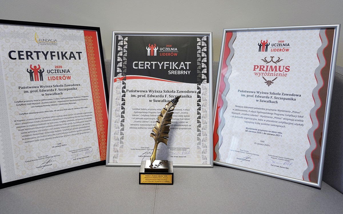 Fundacja Rozwoju Edukacji i Szkolnictwa Wyższego po raz dziesiąty przyznała certyfikaty „Uczelnia Liderów”. Uroczysta gala odbyła się w Łodzi. Ogólnopolski Program Certyfikacji Szkół Wyższych „Uczelnia Liderów” od 2011 roku promuje najlepsze polskie uczelnie, kształcące absolwentów przedsiębiorczych, kreatywnych, wyposażonych w umiejętności i kompetencje przywódcze, zdolnych do osiągania sukcesów na rynku pracy. W jego ramach akredytowane są szkoły wyższe, wydziały, kolegia, które mogą poszczycić się innowacyjnymi działaniami ukierunkowanymi na edukację praktyczną studentów, kreowanie u nich postaw liderskich oraz aktywną współpracę z podmiotami rynku pracy. W 10. edycji wyłoniono około 30 laureatów. Obok PWSZ w Suwałkach wyróżniono również m. in.: Politechnikę Śląską, Akademię Morską w Szczecinie, Akademię Humanistyczno-Ekonomiczną w Łodzi, czy Wyższą Szkołę Informatyki Stosowanej i Zarządzania w Warszawie.