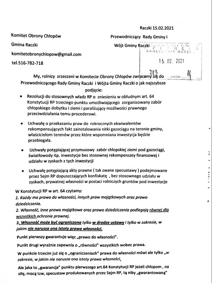 Komitet Obrony Chłopów wystosował do przewodniczącego Rady Gminy i Wójta Gminy Raczki pismo w sprawie budowy gazociągu. Właściciele działek domagają się w nim m.in. udziału w zyskach, które wpłyną do gminnego budżetu za przesył gazu.