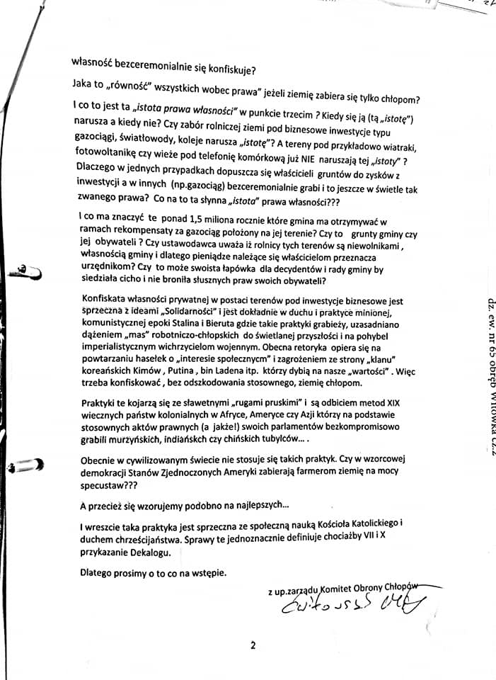 Jak wynika z pisma, gmina ma otrzymać 1,5 mln zÅ‚ rocznie z tytuÅ‚u przebiegu przez jej terytorium gazociÄ…gu polsko - litewskiego. ”Co ma znaczyć te ponad 1,5 miliona rocznie, które gmina ma otrzymywać w ramach rekompensaty za gazociÄ…g poÅ‚ożony na jej terenie? Czy to grunty gminy czy jej obywateli? Czy ustawodawca uważa, iż rolnicy tych terenów sÄ… niewolnikami, wÅ‚asnoÅ›ciÄ… gminy i dlatego pieniÄ…dze należące siÄ™ wÅ‚aÅ›cicielom przeznacza urzÄ™dnikom?” - pytajÄ… w piÅ›mie.