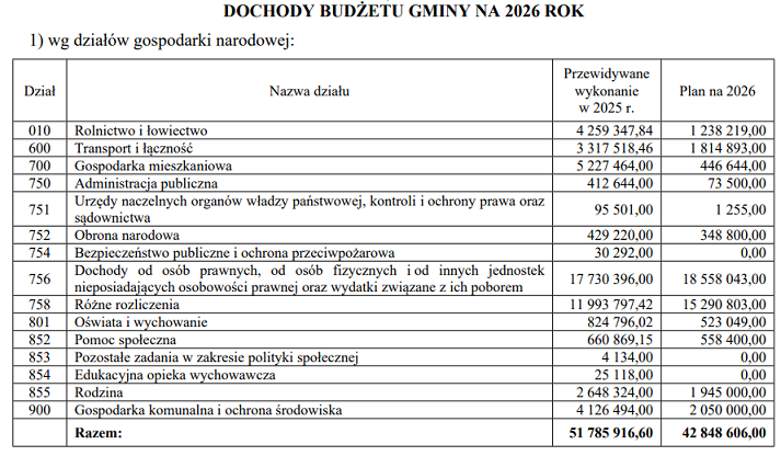 W przyszłym roku dochody gminy mają wynieść 42.848.606 zł, z tego: bieżące - 38.928.383 zł, a majątkowe - 3.920.223 złotych.