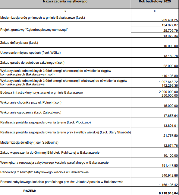 SpoÅ›ród zadaÅ„ majÄ…tkowych planowanych na przyszÅ‚y rok najwiÄ™cej kosztować majÄ…: budowa infrastruktury turystycznej w gminie BakaÅ‚arzewo oraz wykorzystanie odnawialnych źródeÅ‚ energii do oÅ›wietlenia ulic w BakaÅ‚arzewie, a także remont miejscowego koÅ›cioÅ‚a.