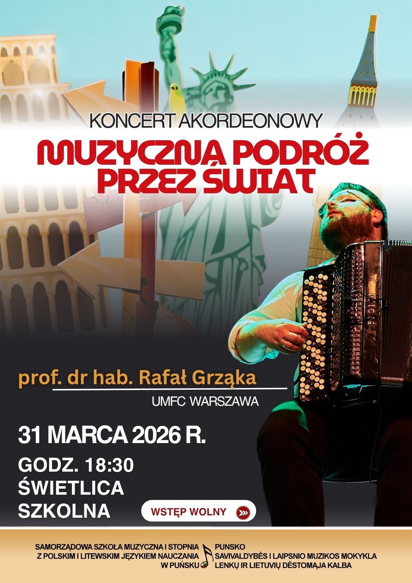 Samorządowa Szkoła Muzyczna I stopnia z Pi LJ N w Puńsku serdecznie zaprasza na koncert akordeonowy „Muzyczna podróż przez świat” .