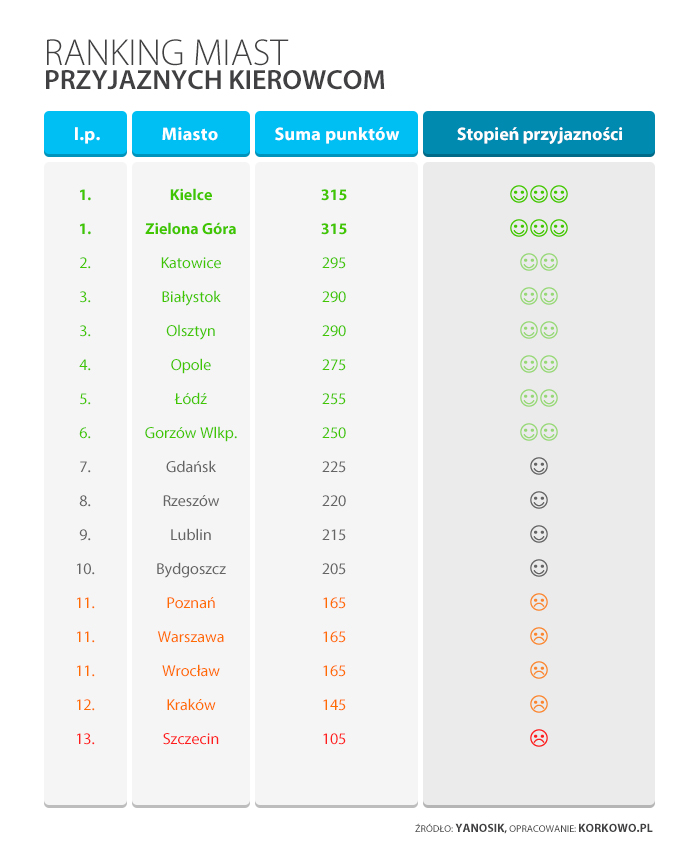 Pod uwagę brano 17 miast sprawdzając średnia prędkość, ceny paliw, koszt godzinnego parkowania w strefie oraz liczbę kolizji na drogach. Na podstawie analizy tych danych stworzono ranking, na czele którego stanęły Kielce oraz Zielona Góra. W rankingu królują mniejsze miasta, w których liczba kierowców jest zdecydowanie niższa. Biorąc pod uwagę sześć największych polskich miast, najwyżej, bo na 7. miejscu, uplasowała się Łódź. Zaraz za nią na 9. miejscu pojawił się Gdańsk, a Poznań, Warszaw, Wrocław i Kraków, zamykają stawkę tuż przed Szczecinem, który tym razem zajął niechlubne, ostatnie miejsce.