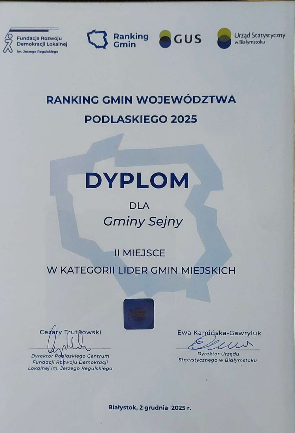 Miasto Sejny zajęło II miejsce w kategorii Gmina miejska Województwa Podlaskiego oraz zostało Liderem Powiatu Sejneńskiego 2025. Gmina Suwałki uplasowała się na III miejscu w województwie w kategorii gmina wiejska oraz została liderem powiatu suwalskiego.