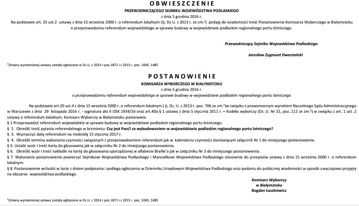 Wojewódzki komisarz wyborczy zastosował się do wyroku NSA i na 15 stycznia 2017 r. wyznaczył przeprowadzenie referendum w sprawie lotniska regionalnego w Podlaskiem.