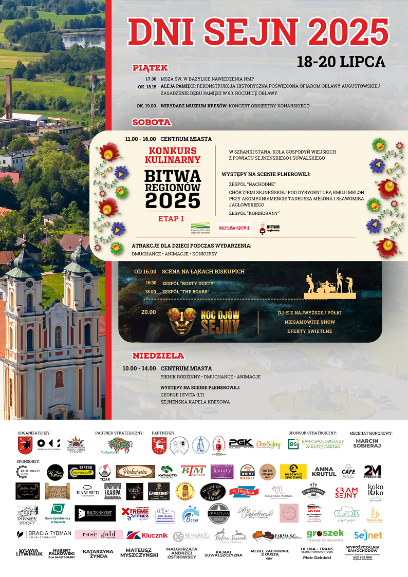 Sobota 19 lipca upłynie pod znakiem kulinarnej rywalizacji i muzycznych emocji. W godzinach 11:00–16:00 w centrum miasta odbędzie się powiatowy etap ogólnopolskiego konkursu „Bitwa Regionów", organizowanego przez Krajowy Ośrodek Wsparcia Rolnictwa. W szranki staną Koła Gospodyń Wiejskich z powiatów sejneńskiego i suwalskiego. To wyjątkowe wydarzenie odbędzie się w Sejnach po raz pierwszy – dzięki zaangażowaniu i inicjatywie Wójt Gminy Sejny Joanny Raś, oraz partnerskiej współpracy pomiędzy samorządami.