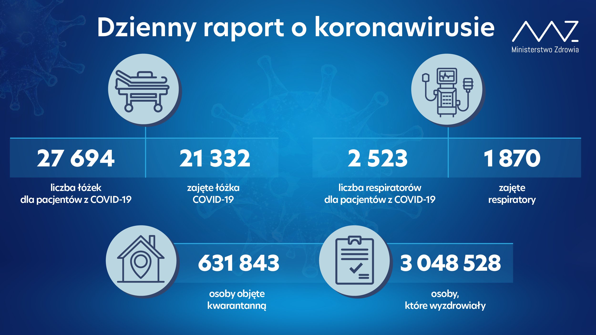 W caÅ‚ym kraju zajÄ™te sÄ… 21 332 spoÅ›ród 27 694 Å‚óżek covidowych. Pod respiratorami znajduje siÄ™ 1 870 pacjentów. W sumie szpitale w kraju dysponujÄ… 2 523 respiratorami dla chorych na koronawirusa.