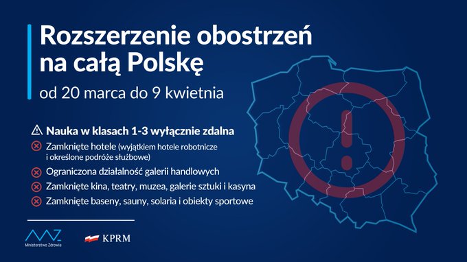 - Sytuacja epidemiczna w Polsce pogarsza siÄ™. Brytyjska mutacja koronawirusa powoduje, że liczba nowych zachorowaÅ„ oraz osób hospitalizowanych znaczÄ…co roÅ›nie. Dlatego, w trosce o zdrowie i życie obywateli, podjÄ™liÅ›my decyzjÄ™ o wprowadzeniu rozszerzonych zasad bezpieczeÅ„stwa w caÅ‚ej Polsce. Dodatkowo rekomendujemy pracÄ™ zdalnÄ… wszÄ™dzie tam, gdzie jest to możliwe. Zasady wprowadzone zostanÄ… od soboty, 20 marca. ObowiÄ…zywać bÄ™dÄ… do 9 kwietnia, czyli obejmÄ… także okres ÅšwiÄ…t Wielkanocnych - tÅ‚umaczy rzÄ…d.