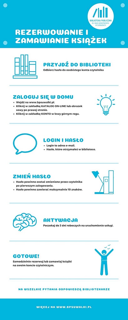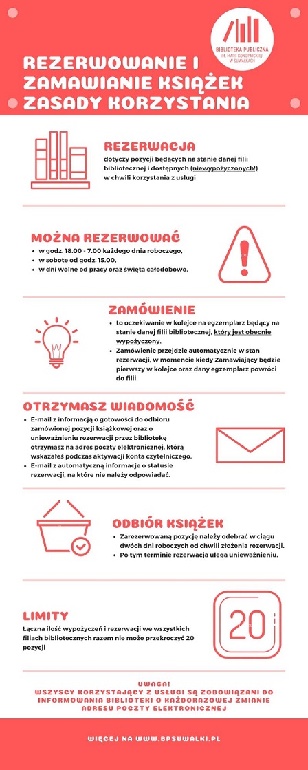 Od wtorku można zamawiać i rezerwować książki w Bibliotece Publicznej im. Marii Konopnickiej w Suwałkach i w filiach. Jak to zrobić? Obejrzyj infografiki.