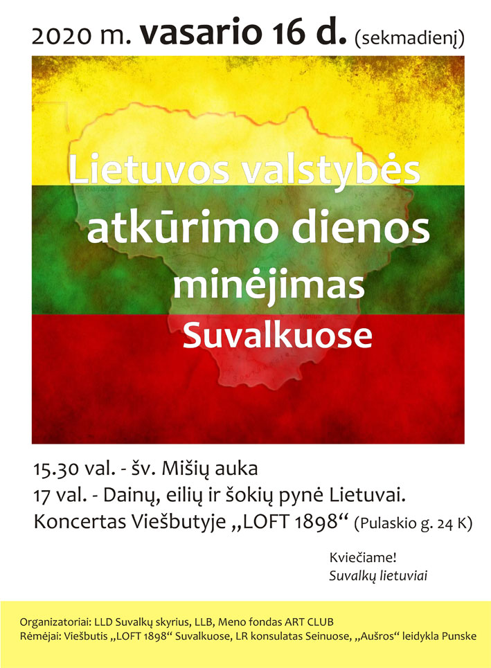 Uroczystości organizuję: Stowarzyszenie Litwinów w Polsce i Klub Artystyczny ART. KLUB. Wspiera Konsulat RL w Sejnach oraz Wydawnictwo „Ausra” z Puńska.