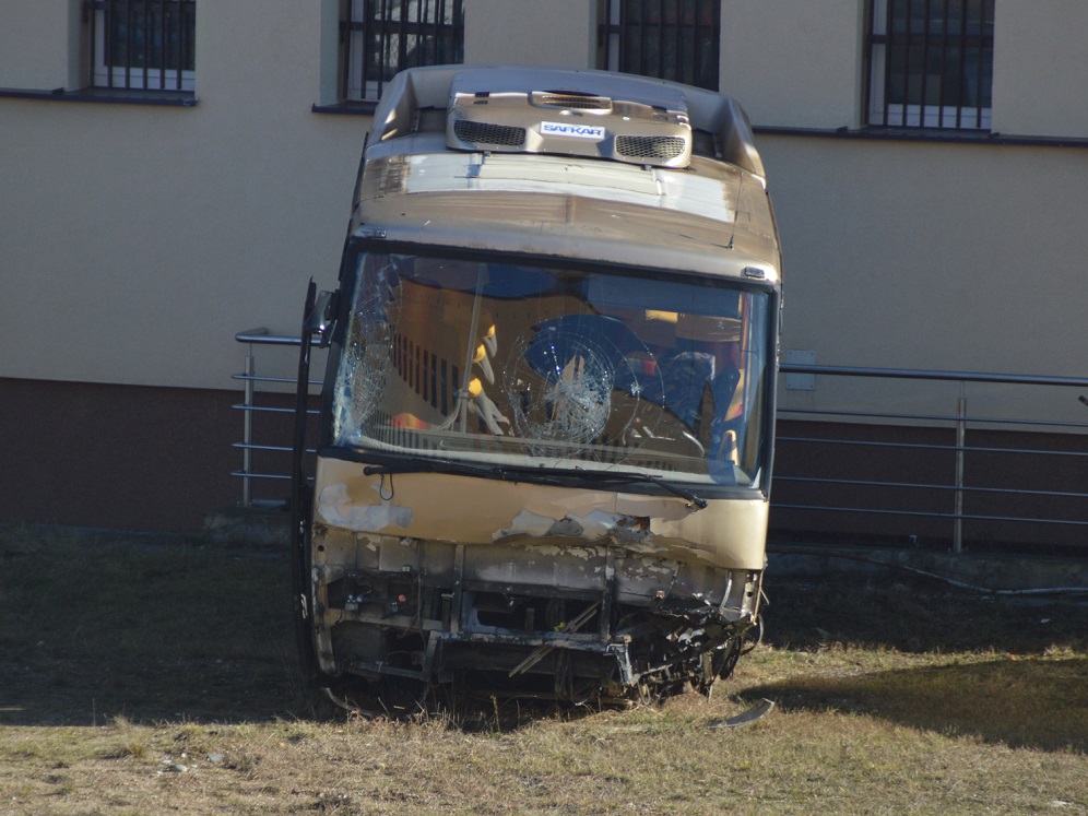 Wrak rozbitego autokaru składowany jest na policyjnym parkingu.