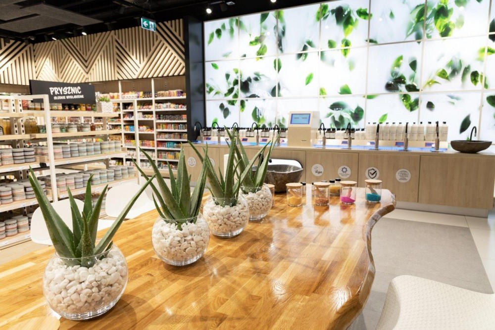 Jednym z hitów tej strefy jest Refill station – automaty, w których klienci mogą napełniać butelki wielokrotnego użytku, np. szamponem, żelem pod prysznic, płynem do prania czy mycia naczyń. W ten sposób dokładamy nasz „kamyczek” do ograniczania zużycia plastiku.