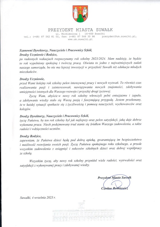 Poniżej prezentujemy list Prezydenta SuwaÅ‚k, który zostaÅ‚ wystosowany do wszystkich suwalskich szkóÅ‚.