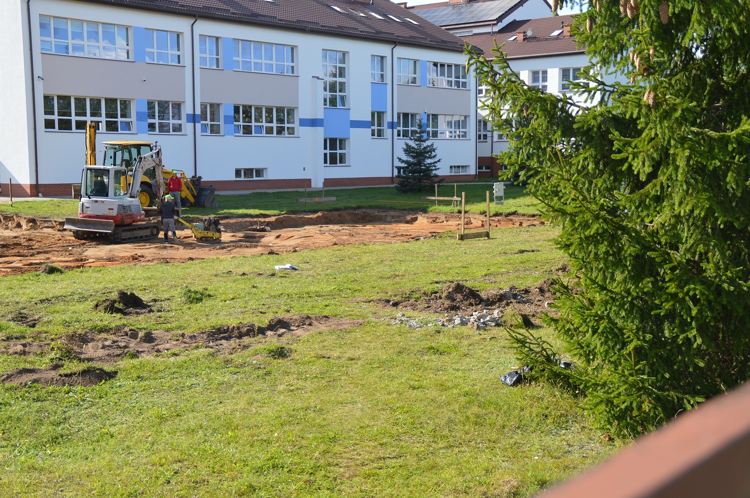 Przedsiębiorstwo Handlowo-Usługowe Łukasz Pałuska wybuduje żłobek w Raczkach. Prace (przy Szkole Podstawowej od strony ul. Kaczorowskiego, Górskiego) już ruszyły. Robotnicy pracują nad wykopem.