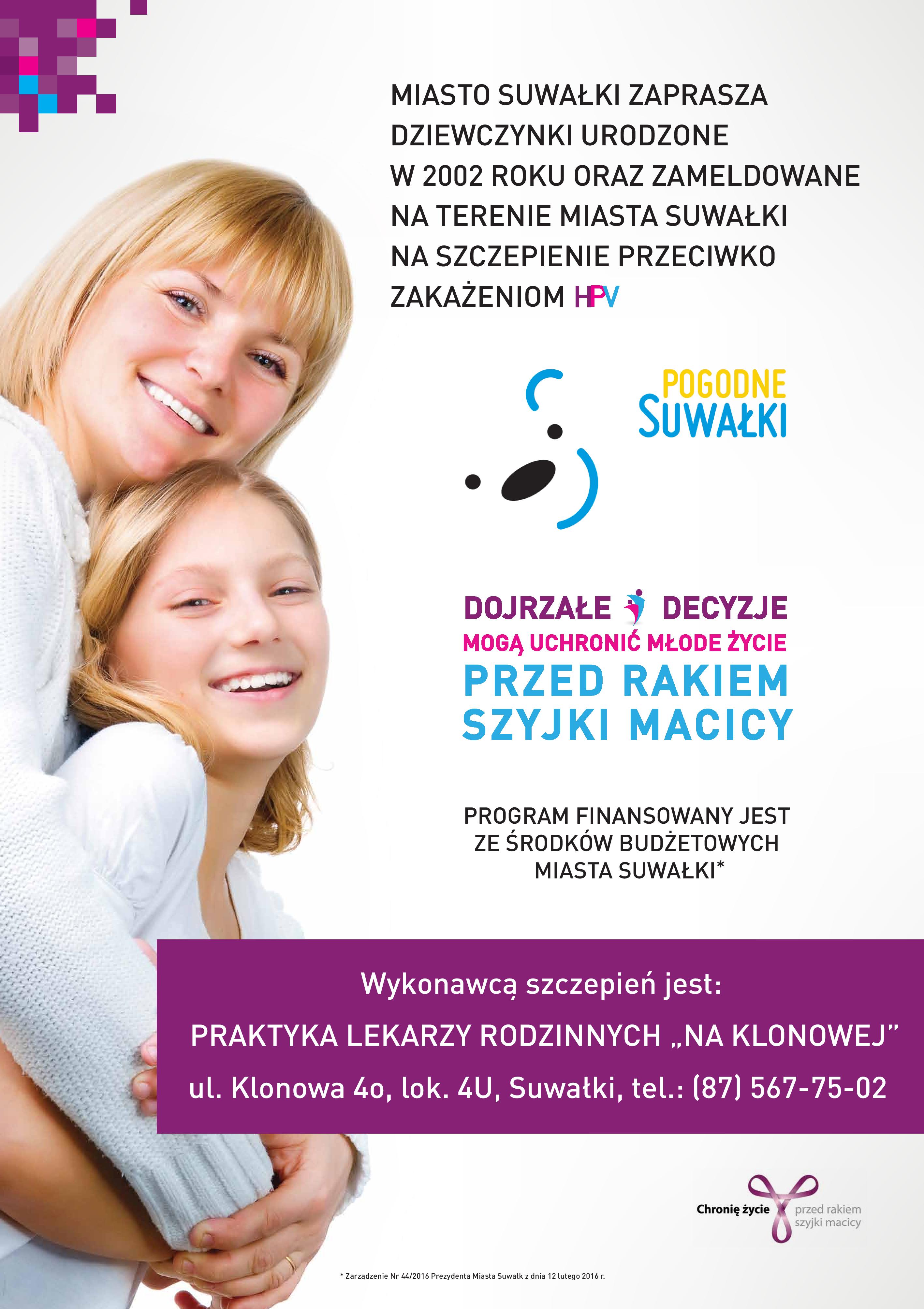 W ramach programu dziewczynki z rodzin uprawnionych do świadczeń rodzinnych lub karty Suwalska RODZINA PLUS bezpłatnie otrzymają szczepienia przeciwko HPV. Pozostałe płacą tylko 50% ceny szczepionki (całkowity koszt wynosi 65,00 x 3 dawki-obejmuje tylko połowę ceny szczepionki). Kwalifikacja do szczepienia jest bezpłatna.