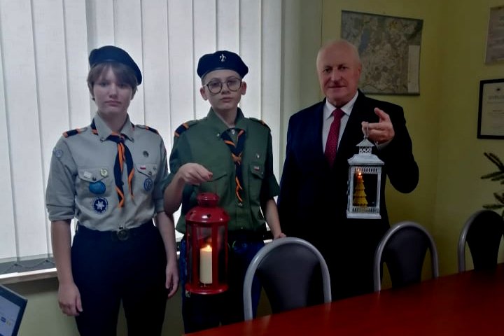 Druhna Anita Kalinowska i druh Sebastian Racis przekazali PÅ‚omieÅ„ z Groty Narodzenia na rÄ™ce gospodarza gminy, wójta Piotra Sinkiewicza, który odpaliÅ‚ ÅšwiatÅ‚o do przygotowanego lampionu.