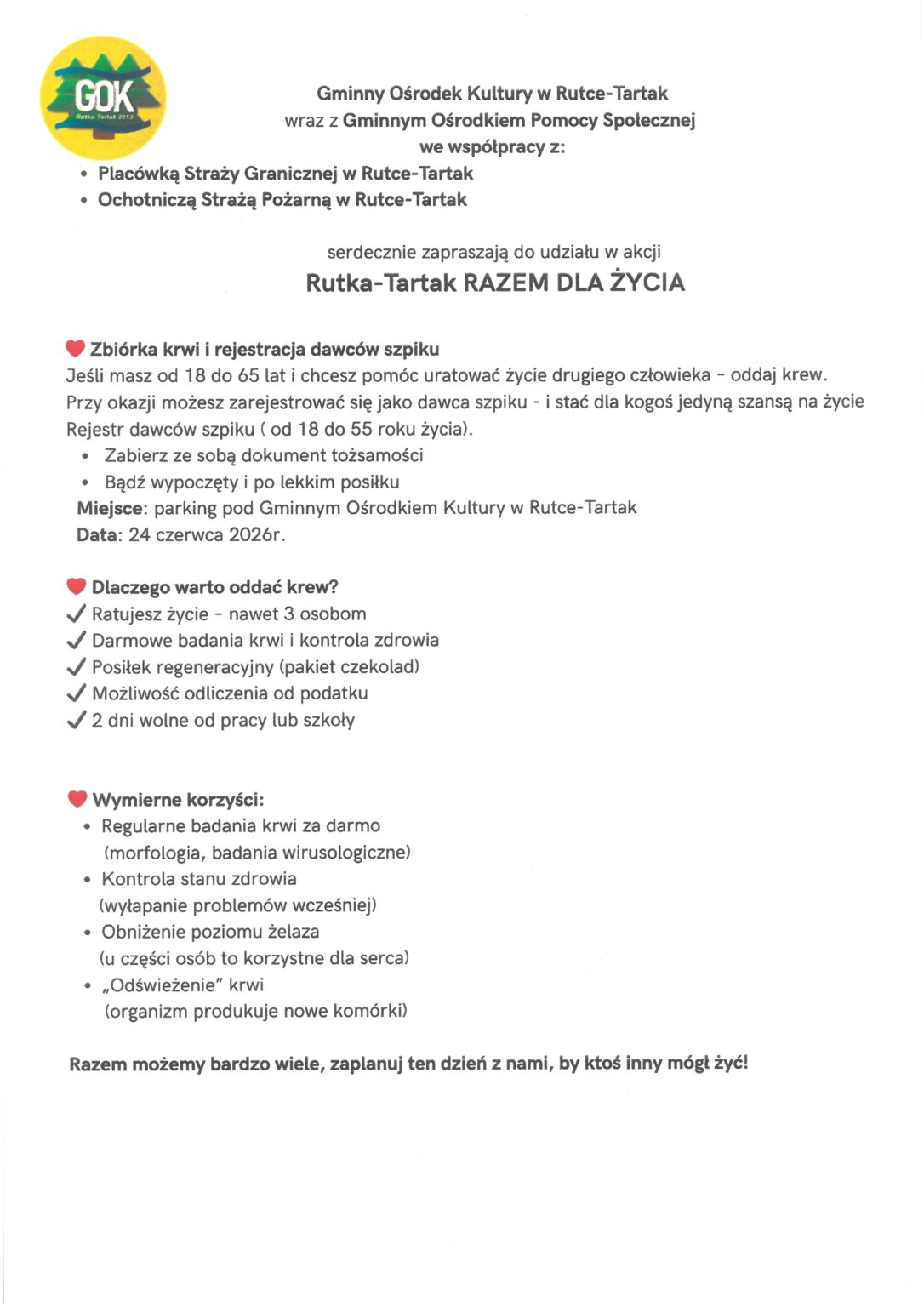 Gminny Ośrodek Kultury, Gminny Ośrodek Pomocy Społecznej Placówka Straży Granicznej w Rutce- Tartak oraz OSP zapraszają do udziału w akcji pn. Rutka – Tartak: Razem dla Życia.