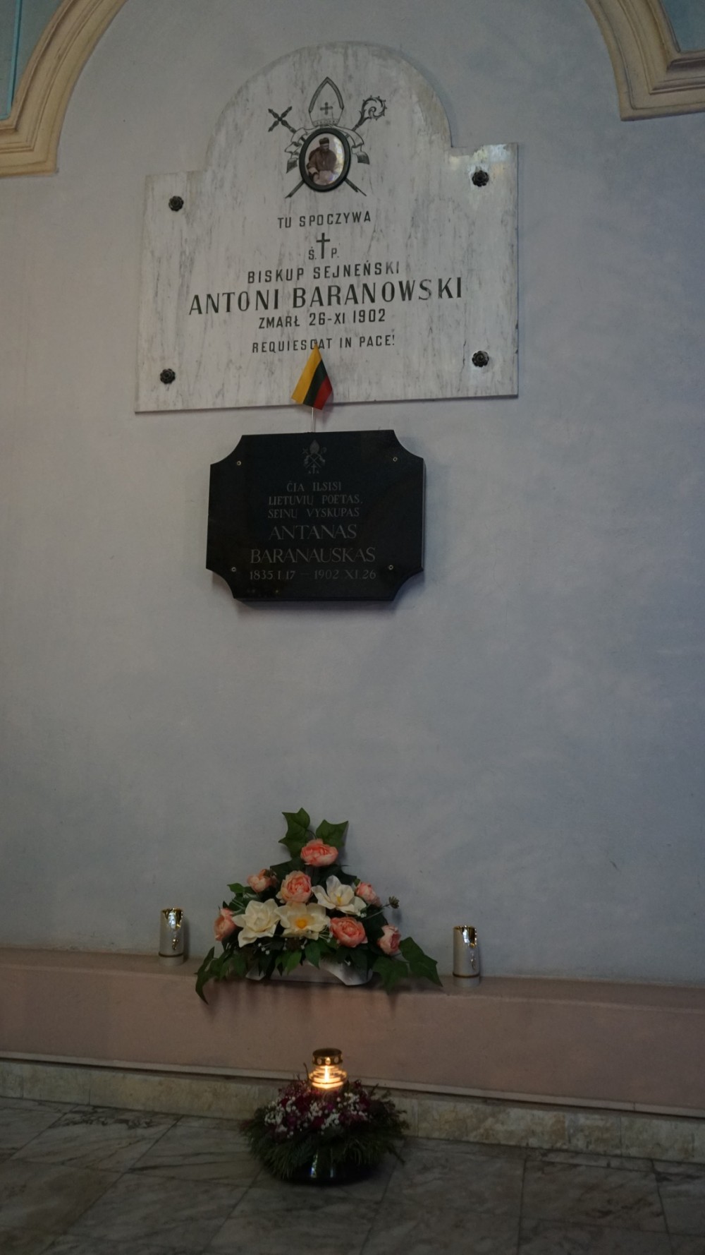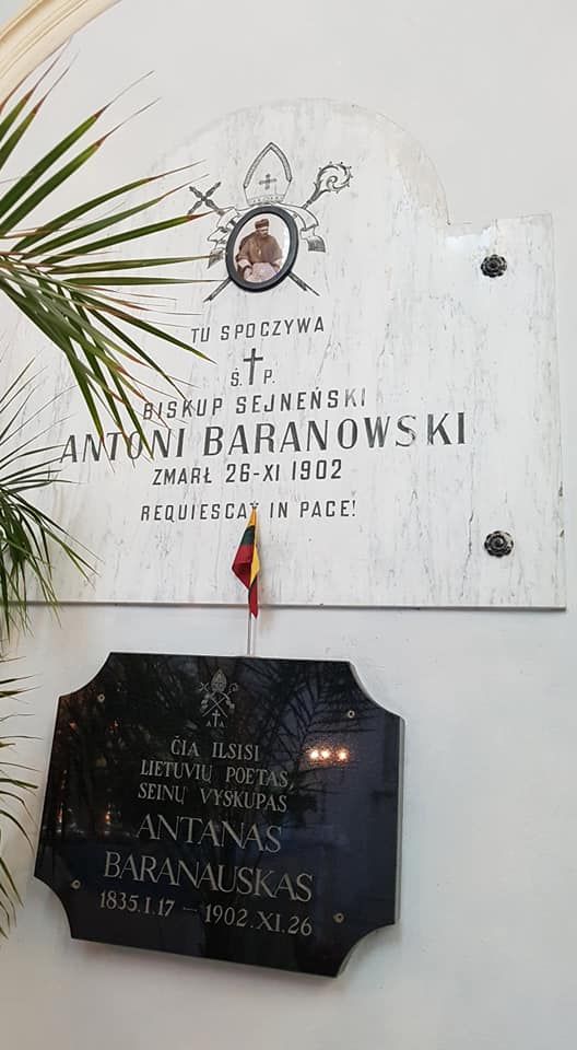 Tablice nagrobkowe zostały napisane w dwu językach: polskim i litewskim. ,,Čia ilsisi lietuviu poetas, Seinu vyskupas Antanas Baranauskas” – głosi ta w języku litewskim. Prawie tak samo, – czyli,,tu spoczywa biskup sejneński Antoni Baranowski…” - brzmi polskojęzyczny napis. Prawie tak samo, bo zabrakło słów, że był także litewskim poetą.