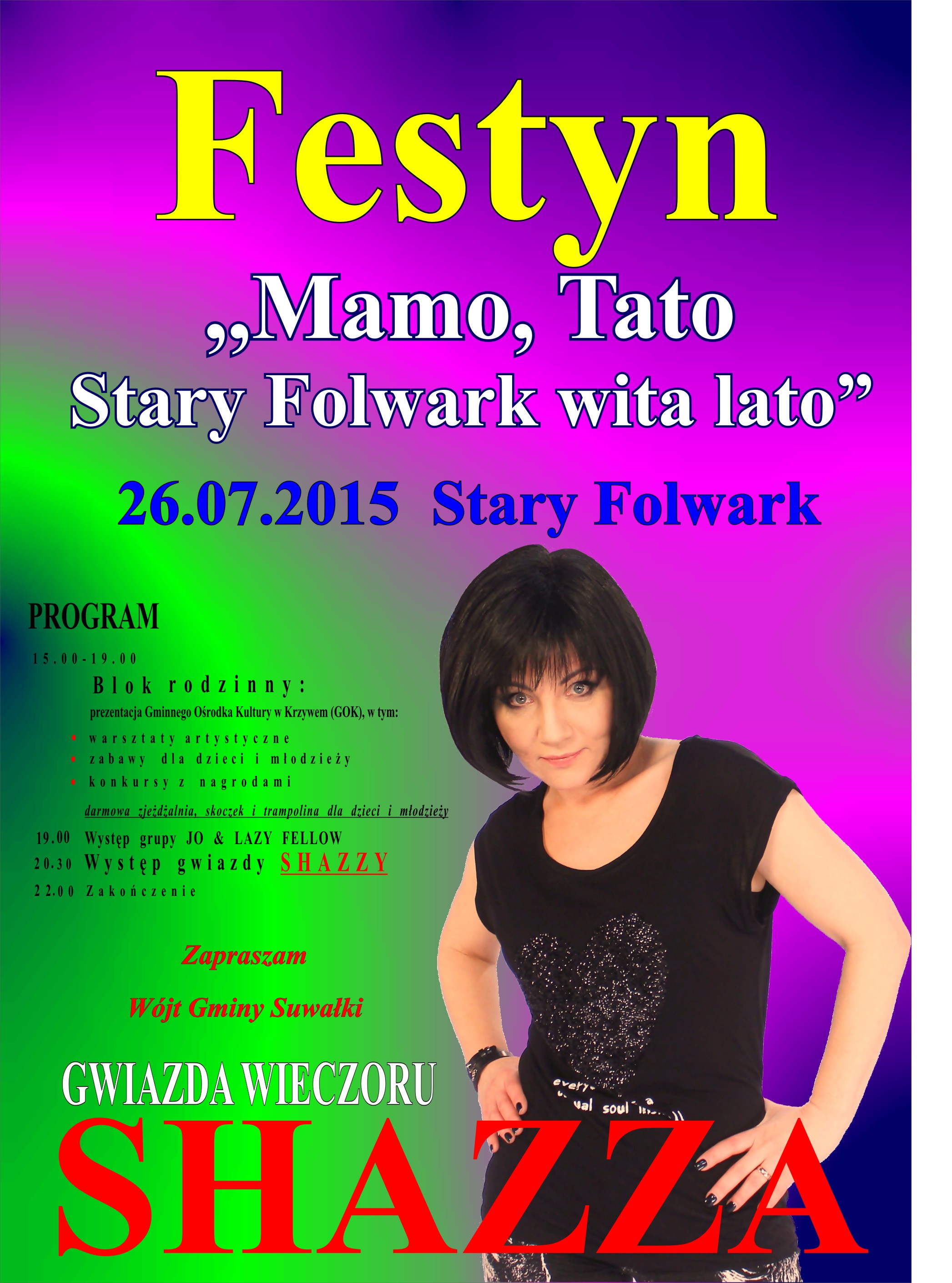 Wójt Gminy Suwałki i Gminny Ośrodek Kultury Krzywe zapraszają mieszkańców gminy, miasta, turystów w niedzielę od godz. 15.00 do Starego Folwarku, na festyn „Mamo, tato, Stary Folwark wita lato”. W programie oprócz warsztatów artystycznych, gier, zabaw i konkursów dla dzieci oraz młodzieży, będą też koncerty grupy Jo & Lazy Fellow (od godz. 19.00) i gwiazdy wieczoru SHAZZY (od 20.30).