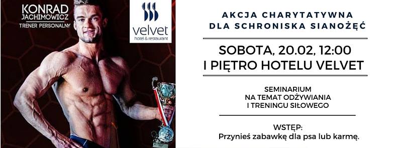Suwalczanin Konrad Jachimowicz, na co dzień trener personalny w siłowni Calypso oraz uznany już kulturysta w kategorii fitness zaprasza do udziału w charytatywnym seminarium na rzecz schroniska Sianożęć w Suwałkach.
