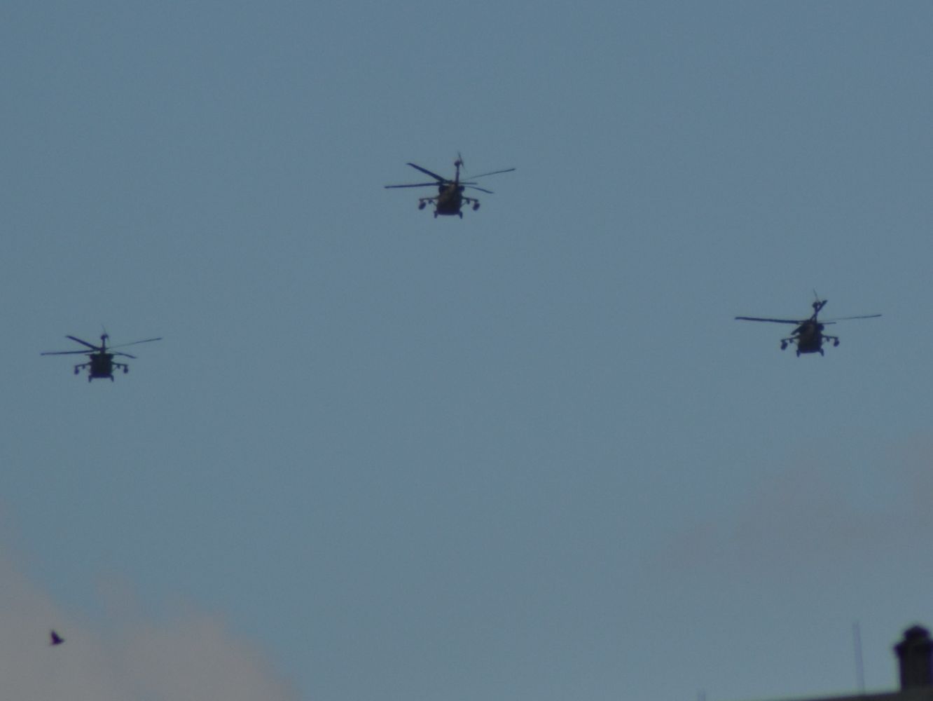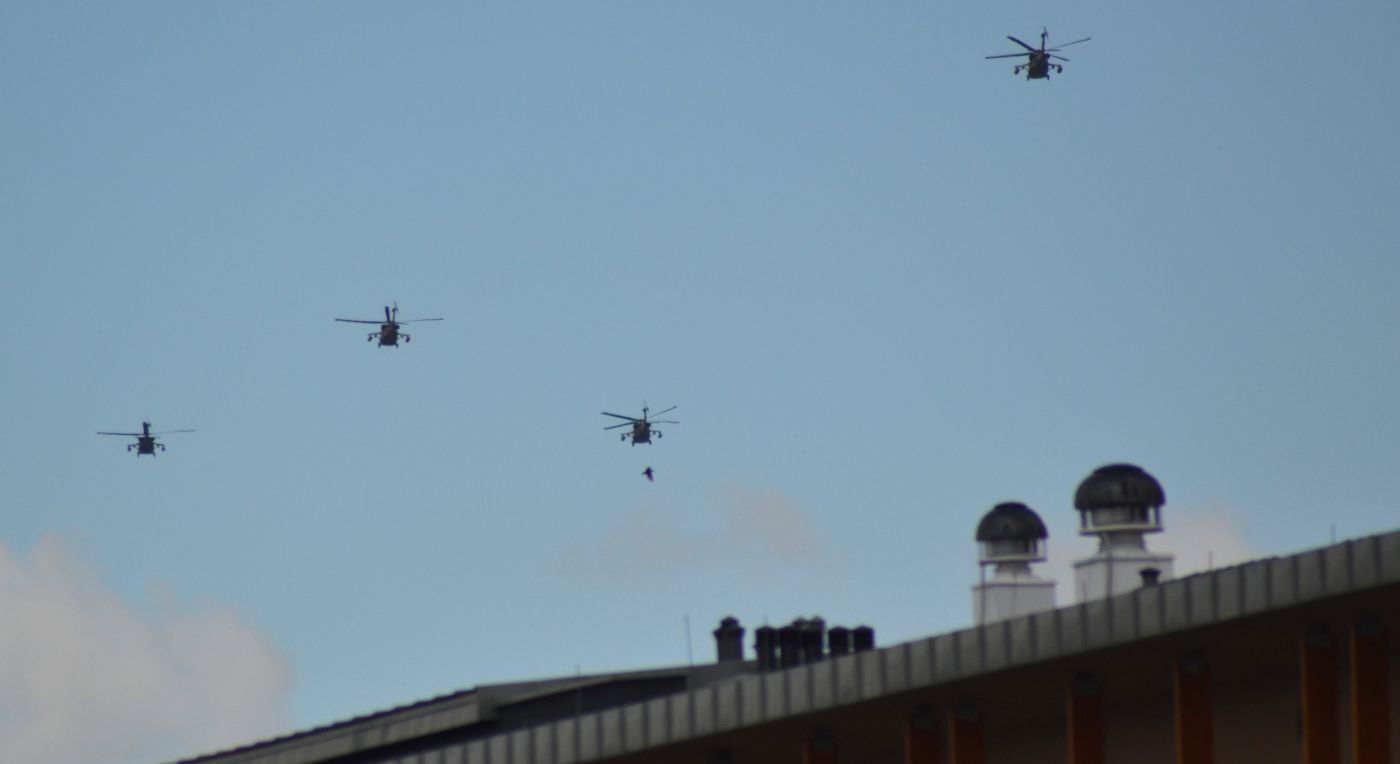 Cztery śmigłowce przeleciały nad Suwałkami tuż po godzinie 14.00. Przecięły niebo lecąc od południa nad osiedle Północ i dalej w kierunku granicy z Litwą. - To na pewno nasze? - denerwował się suwalczanin, który, aby je zobaczyć wybiegł na parking.