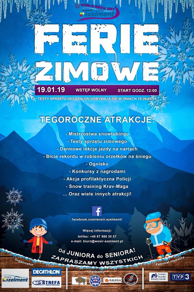 W niedzielę, 20 stycznia na terenie WOSiR Szelment rozpoczęły się ferie zimowe 2019 r. Uroczystego otwarcia imprezy dokonał Prezes WOSiR Szelment Paweł Żuk. Na uczestników pierwszego dnia ferii czekało wiele atrakcji, a wśród nich testy sprzętu narciarskiego firmy Decathlon, akcja profilaktyczna suwalskiej komendy Policji ,,Bezpieczny Stok’’, pokazy śnieżnego treningu sztuki obrony Krav-Maga i bicie rekordów w robieniu orzełków na śniegu.