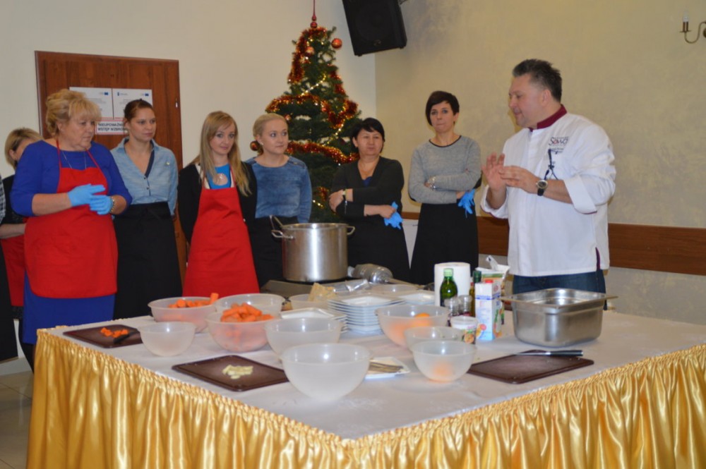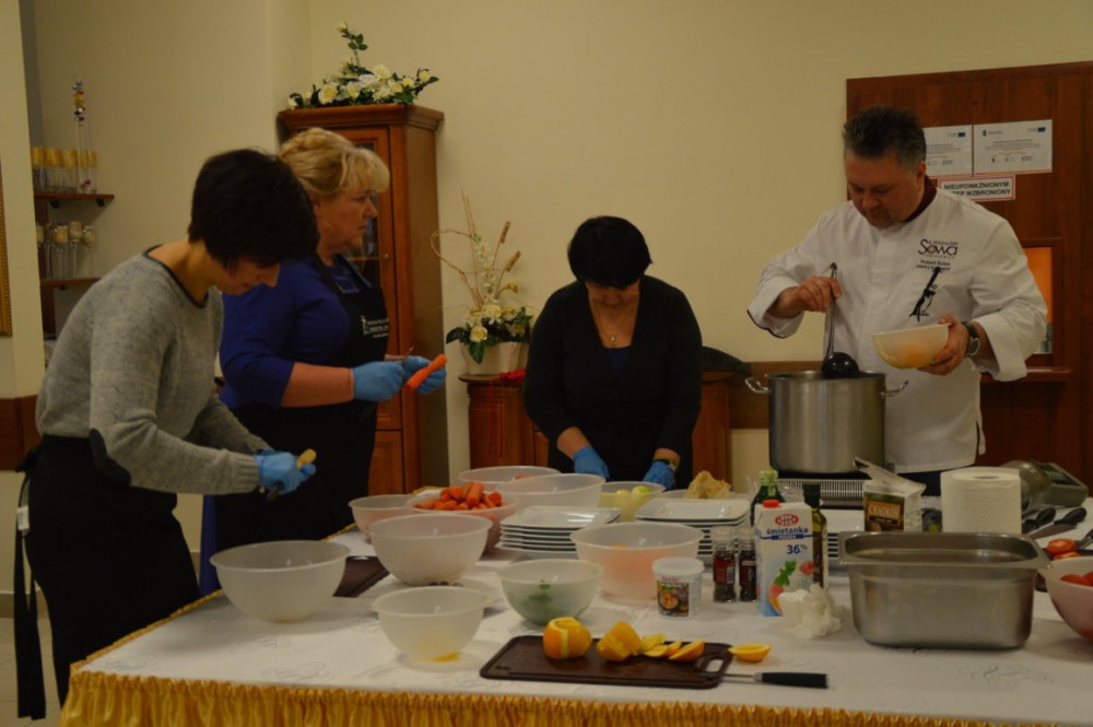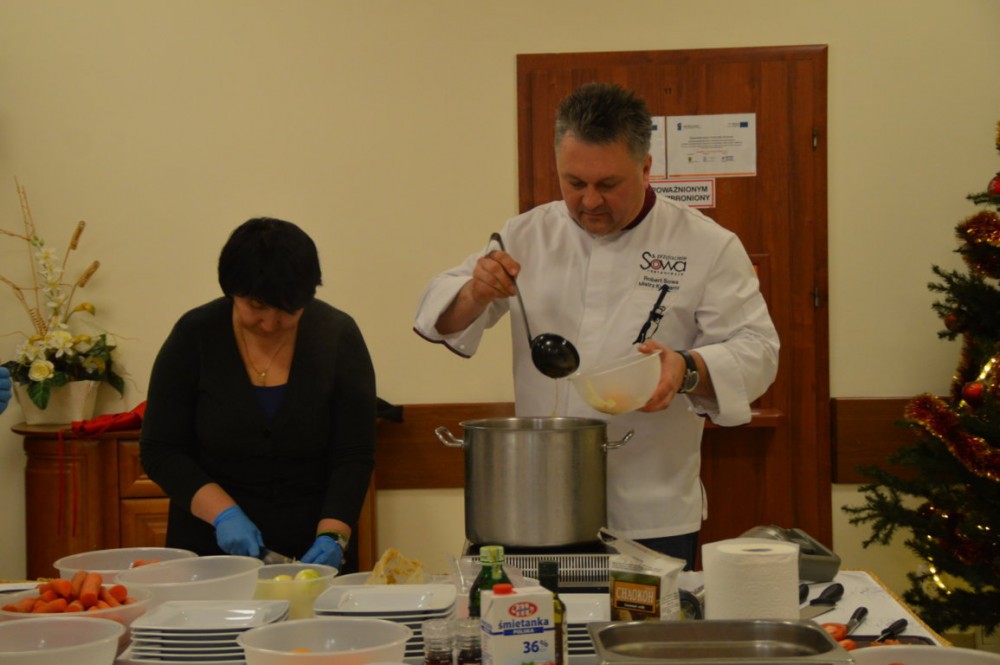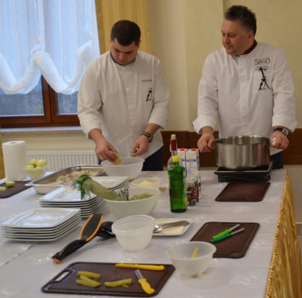 W Lipniaku Sowa przygotowywaÅ‚ m.in. pierÅ› z kaczki z gruszkami i przyprawami korzennymi, zupÄ™ z krewetkami, marynowanego dorsza w sosie ogórkowym oraz pierożki z makiem. We wspólnym gotowaniu z mistrzem wziÄ™li udziaÅ‚ uczestnicy projektu „Stworzenie i wsparcie funkcjonowania ZakÅ‚adu AktywnoÅ›ci Zawodowej w Lipniaku”, pracownicy SOW-y na czele z paniÄ… dyrektor oraz terapeuci z zaprzyjaźnionych oÅ›rodków.