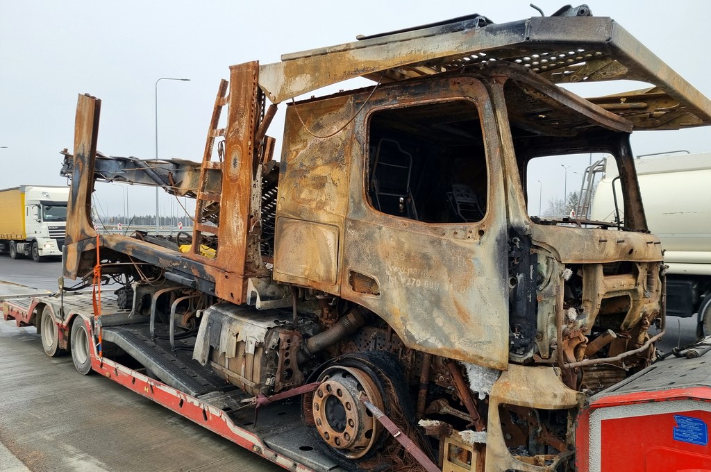 Nielegalny transport odpadów zatrzymali funkcjonariusze podlaskiej Krajowej Administracji Skarbowej (KAS) z Budziska. Spalona ciężarówka była przewożona na lawecie bez odpowiednich zezwoleń oraz zgłoszenia w Systemie Elektronicznego Nadzoru Transportu (SENT).