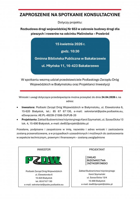 Urząd Gminy Bakałarzewo zaprasza na spotkanie konsultacyjnie w sprawie rozbudowy drogi wojewódzkiej Nr 653 od Malinówki do Przebrodu.
