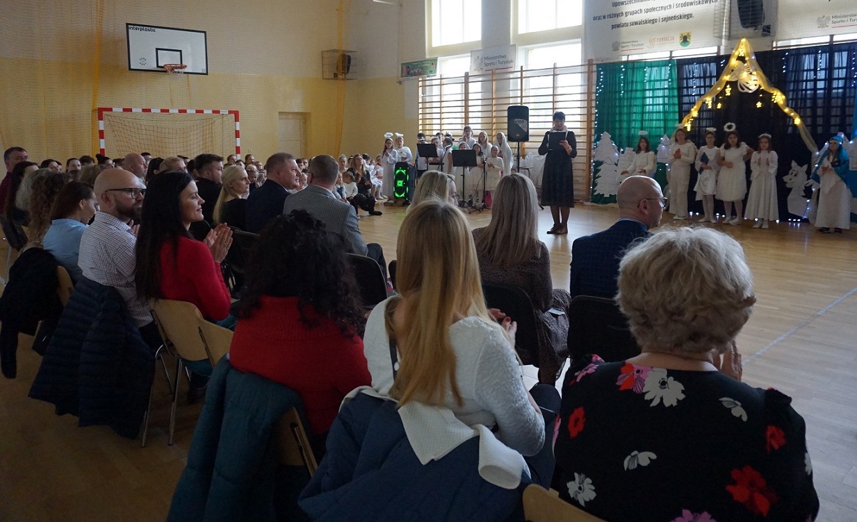 W piÄ™knie udekorowanej sali gimnastycznej zebrali siÄ™ zaproszeni goÅ›cie, nauczyciele, dzieci z przedszkola, dzieci ze szkoÅ‚y, rodzice, pracownicy szkoÅ‚y. PiÄ™kna scenografia wprowadziÅ‚a zgromadzonÄ… publiczność w Å›wiÄ…teczny nastrój.