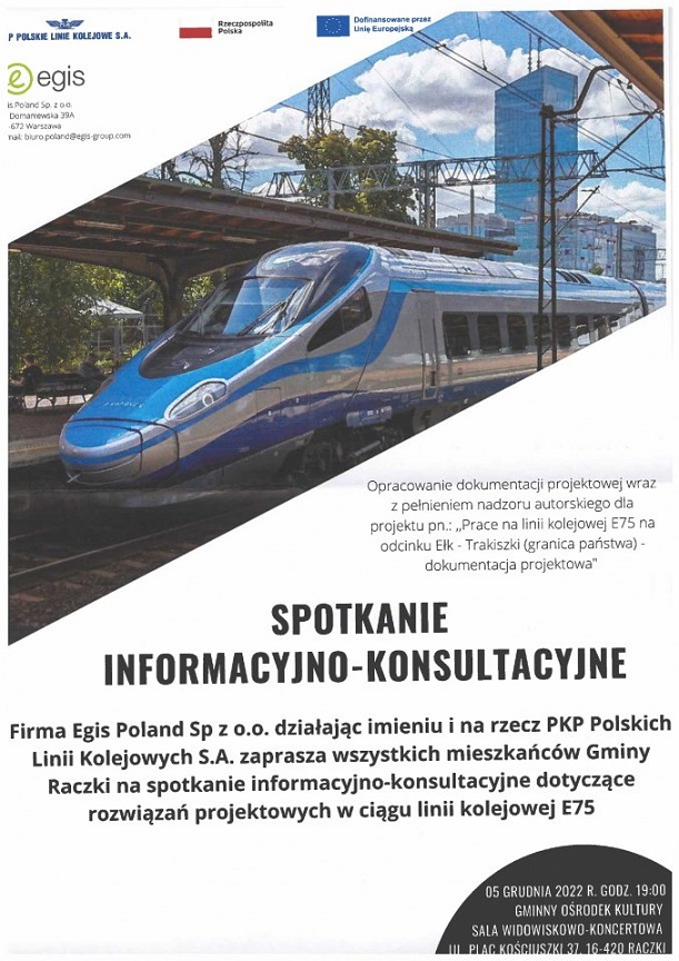 Biuro projektowe Egis Poland zaprasza mieszkańców gminy Raczki oraz osoby zainteresowane przebiegiem linii kolejowej E75 (Rail Baltica) na spotkanie informacyjno - konsultacyjne.