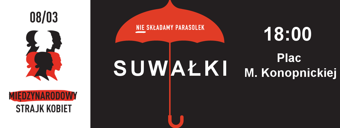Strajk kobiet w SuwaÅ‚kach rozpocznie siÄ™ o 18.00 na Placu im. Marii Konopnickiej, nastÄ™pnie kobiety przejdÄ… ulicami: KrótkÄ…, Noniewicza, WaryÅ„skiego, KoÅ›ciuszki, ChÅ‚odnÄ… i wrócÄ… na Plac im. Marii Konopnickiej.