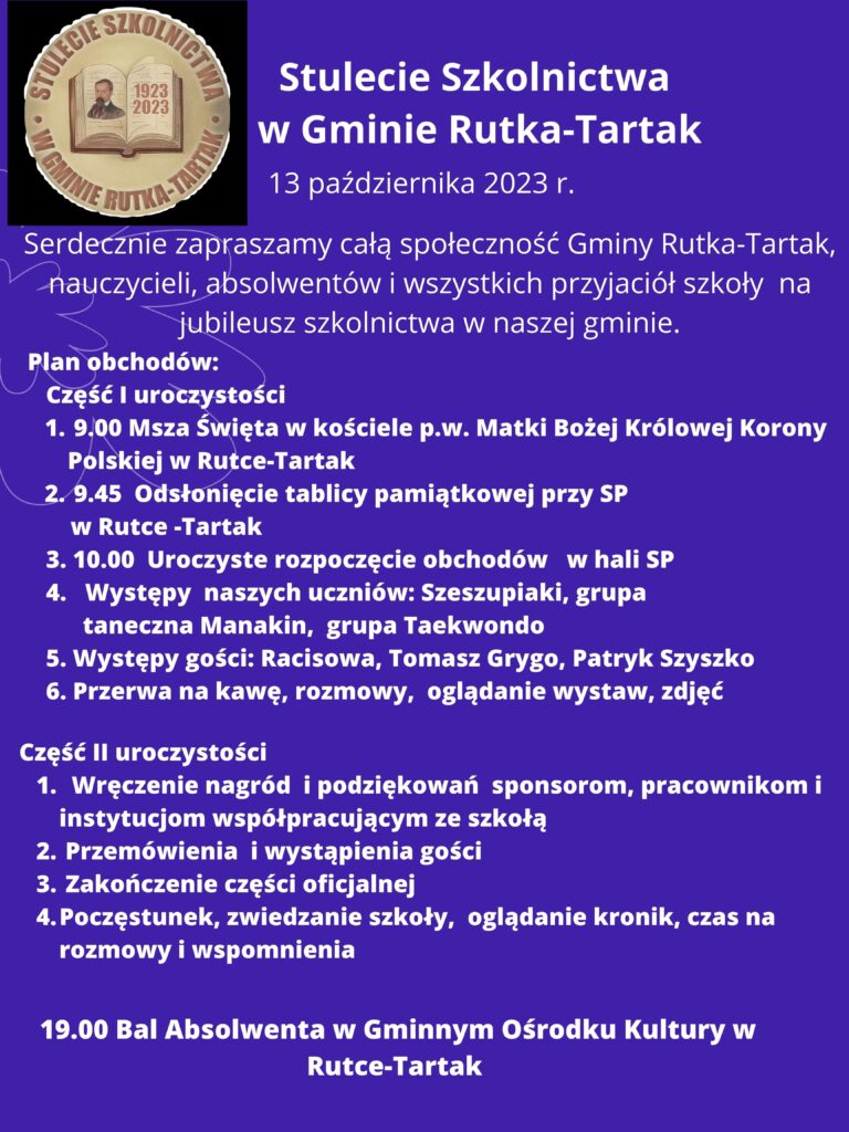W następny piątek, 13 października odbędą się Obchody Stulecia Szkolnictwa w Gminie Rutka-Tartak. Z tej okazji Komitet organizacyjny serdecznie zaprasza całą społeczność Gminy, wszystkich nauczycieli i absolwentów na wspólne świętowanie.
