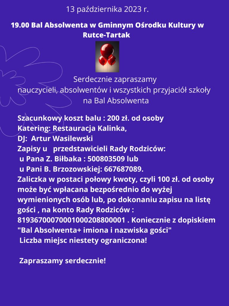 Rada Rodziców SzkoÅ‚y Podstawowej im. Henryka Sienkiewicza w Rutce- Tartak zaprasza również wszystkich chÄ™tnych na Bal Absolwenta, który odbÄ™dzie siÄ™ tego samego dnia o godz. 19.00 w Gminnym OÅ›rodku Kultury.