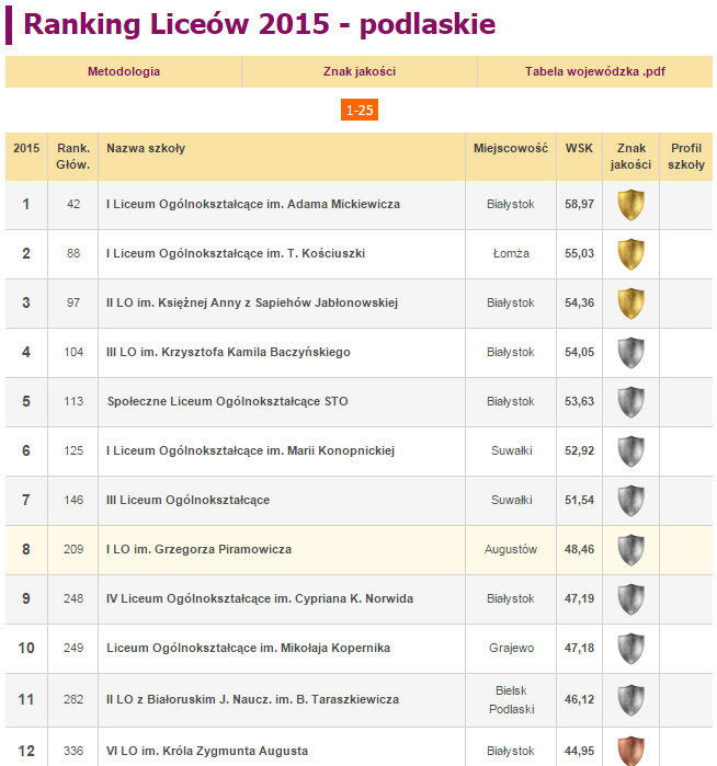 I Liceum Ogólnokształcące w Suwałkach od lat plasuje się w pierwszej dziesiatce najlepszych liceów w województwie podlaskim w rankingu Perspektyw.